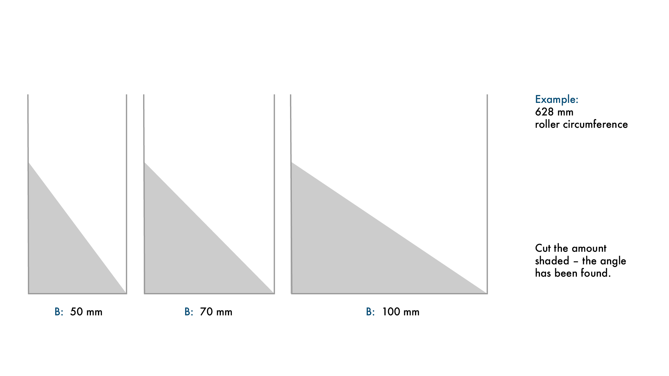 You require the roller circumference to obtain the application angle. This is then transferred to the cover as a distance. EXAMPLE: Roller diameter 200 mm = roller circumference 628 mm.